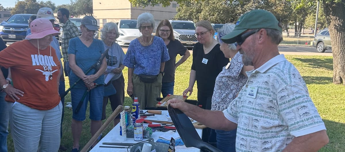 On Sunday, Nov. 16, Anderson Mill residents enjoyed a hands-on workshop on caring for and sharpening garden tools. Six Master Gardeners from Travis County spent two hours guiding participants through cleaning, maintenance, and sharpening techniques. An information table offered gardening advice, free seed packets, gardening handouts, and helpful literature on