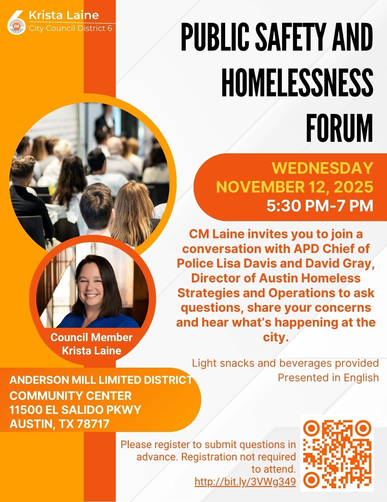 Join District 6 Council Member Krista Laine for a Public Safety & Homelessness Forum on Wednesday, November 12 from 5:30-7 PM. Registered attendees may submit questions. See flyer below for registration information.